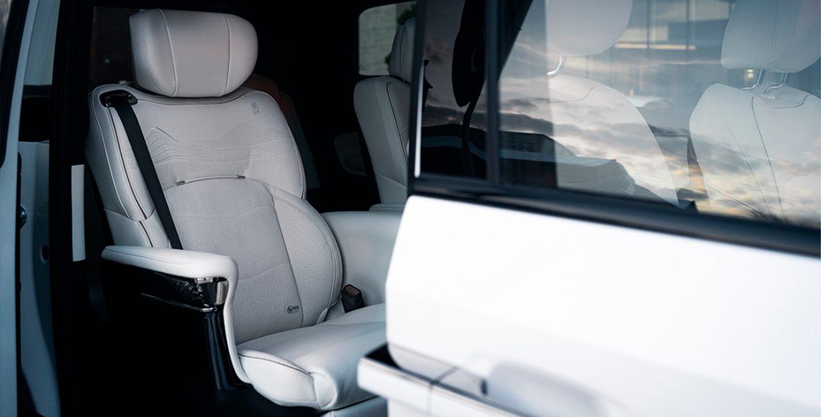 В салоне располагаются семь мест с роскошной отделкой и компоновкой «2 + 2 + 3». На втором ряду два капитанских кресла, в подушки и спинки которых интегрированы воздушные камеры, обеспечивающие массаж бедер, спины и плеч. Кроме того, предусмотрены выдвижные подножки-оттоманки. За управление всеми этими функциями отвечают сенсорные панели на подлокотниках, а на потолке расположены органы управления сдвижными дверями и люком. Третий ряд представлен диваном.